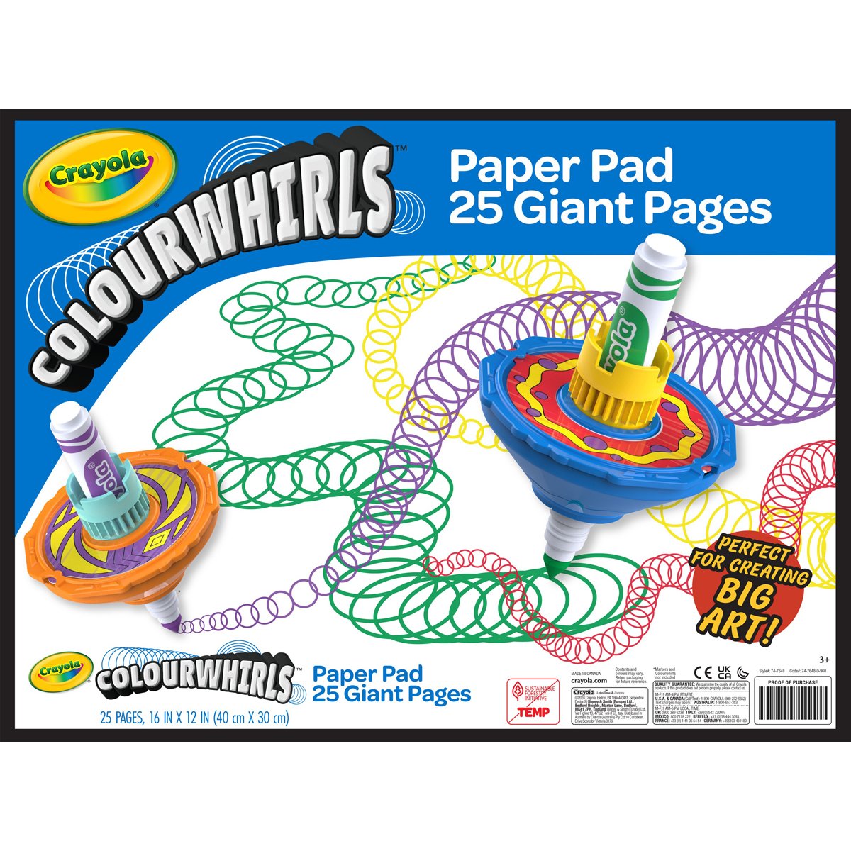 Step into a world of vibrant and spiraling art with the Crayola Colourwhirls Paper Pad. This art paper has plenty of room to create, resulting in captivating outcomes that will delight both children and adults. The Colourwhirls Paper Pad opens up endless possibilities for artistic expression. With 25 giant pages included, kids can create stunning, mess-free, swirly art. The giant pages provide ample space for exciting Colourwhirls competitions and the creation of unique art. The thick paper ensures that ink wont bleed through, maintaining the integrity of each masterpiece. Perfect for friendly competitions, this craft paper pad pairs seamlessly with Crayola Colourwhirls (sold seperately), allowing kids to engage in art-filled fun and competition. Rip Em & Spin Em, again and again with more pages for competition. This product is an excellent gift choice for boys and girls, thanks to the endless hours of creative fun it provides. Recommended for children aged 3 and above. INCLUDES: 1 paper pad with 25 giant 40 x 30cm pages