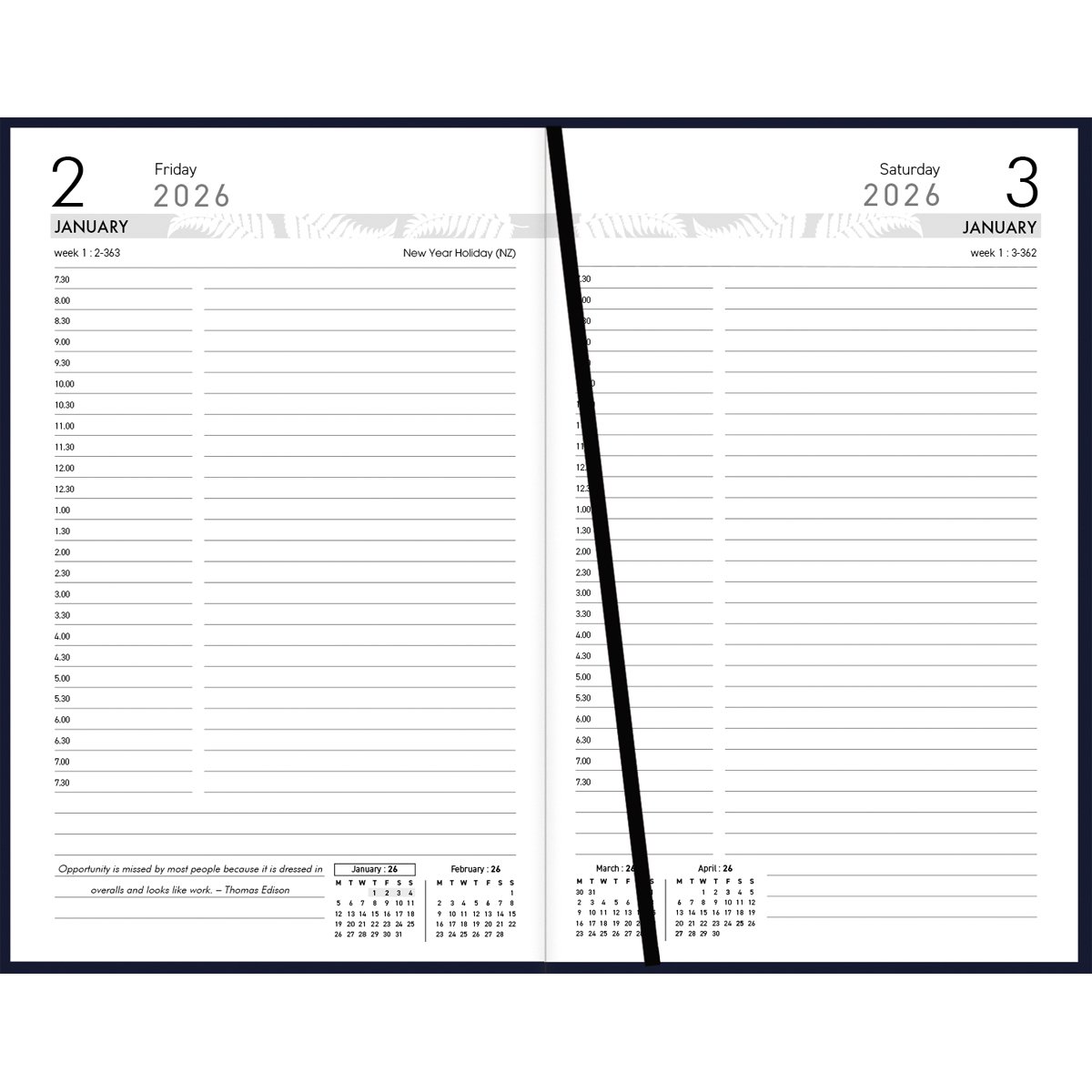 195x125mm. Day to view, full day Sat/Sun, 1/2 hour appointments 7.30am-7.30pm. Daily quotations. Ribbon marker. Sewn, flexible, PVC cover.