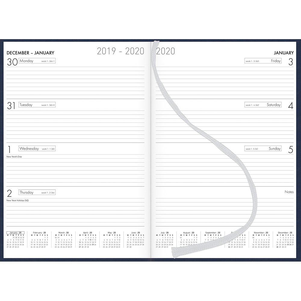Week to view. Ribbon marker. Sewn, hard cover, book cloth cover.