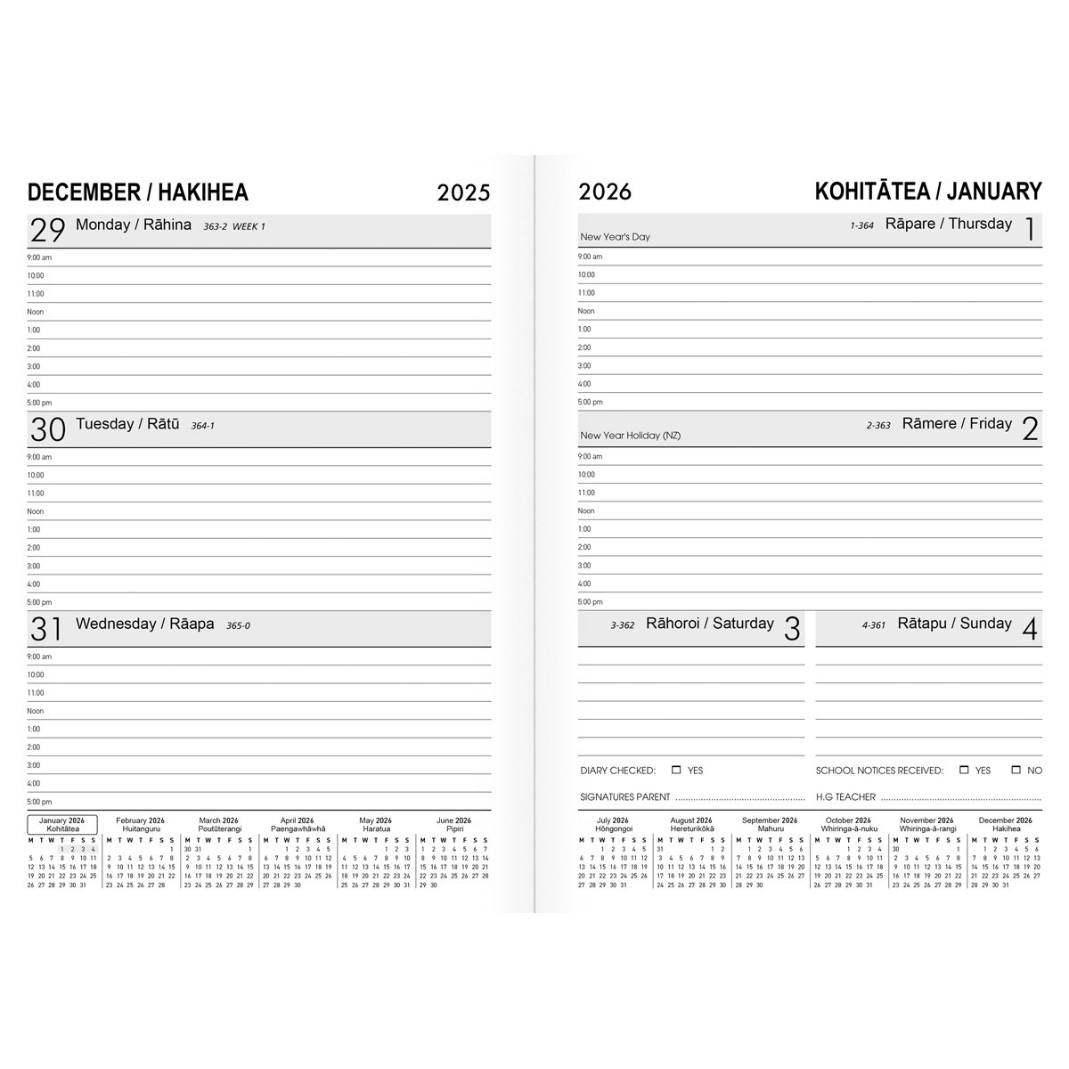 Student Spiral: Week to view. School timetable, sports/activities, assignments. Spiral bound, flexible, polyprop with laminated cover behind.