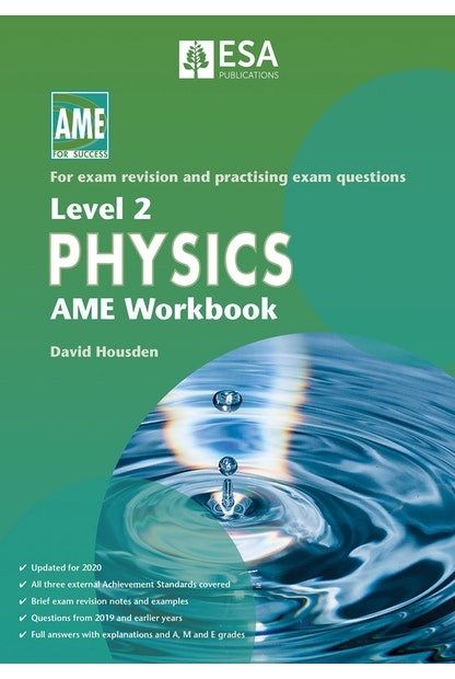 Level 2 Physics AME Workbook has been updated for 2020. It covers the three external Achievement Standards: Physics 2.3 - Demonstrate understanding of waves; Physics 2.4 - Demonstrate understanding of mechanics; Physics 2.6 - Demonstrate understanding of electricity and electromagnetism. This workbook has brief exam revision notes for end-of-year study, with examples and NCEA exam questions from 2019 and earlier years. Full answers with explanations and A, M, and E grades are given. Use this workbook all year round or during Terms 3 and 4 to revise and practise exam questions.