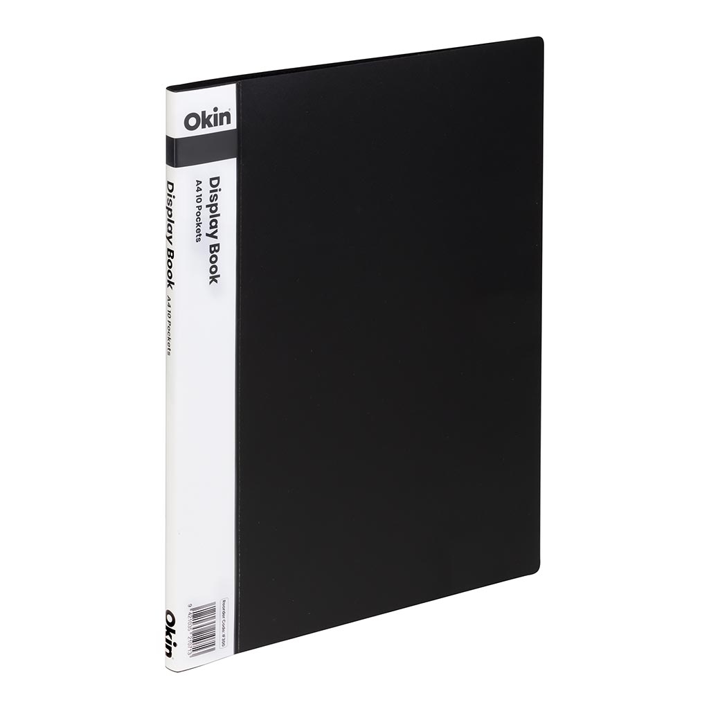Okin Display Books are an ideal way to hold and display your A4 documents. Clear plastic polypropylene pages keep your paper and documents securely protected. Pockets are securely bound into the the spine of the durable polypropylene cover. Insert spine allows you to personalise your display book. A4 size. 10 pockets. 20 page capacity. Black colour.