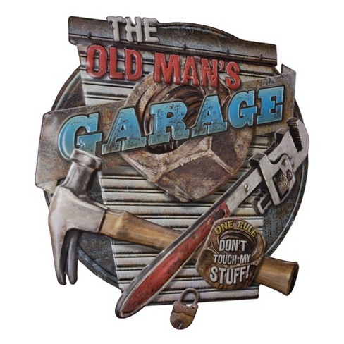 There’s only one rule in the old man’s garage: don’t touch my stuff.Give the mechanic in your life a little humorous decor for their auto shop, garage, man cave or basement with this embossed metal hanging sign that details various tools and equipment.Made from lightweight metal and offering a weathered and distressed aesthetic, this sign features bold and impactful lettering that makes the sign visible from far away.Measuring 16.5” H x 15.5” L and outfitted with a saw-tooth hanger for easy hanging, this wall decor sign is a breeze to hang and makes for a great addition to other vintage signs you may be collecting.