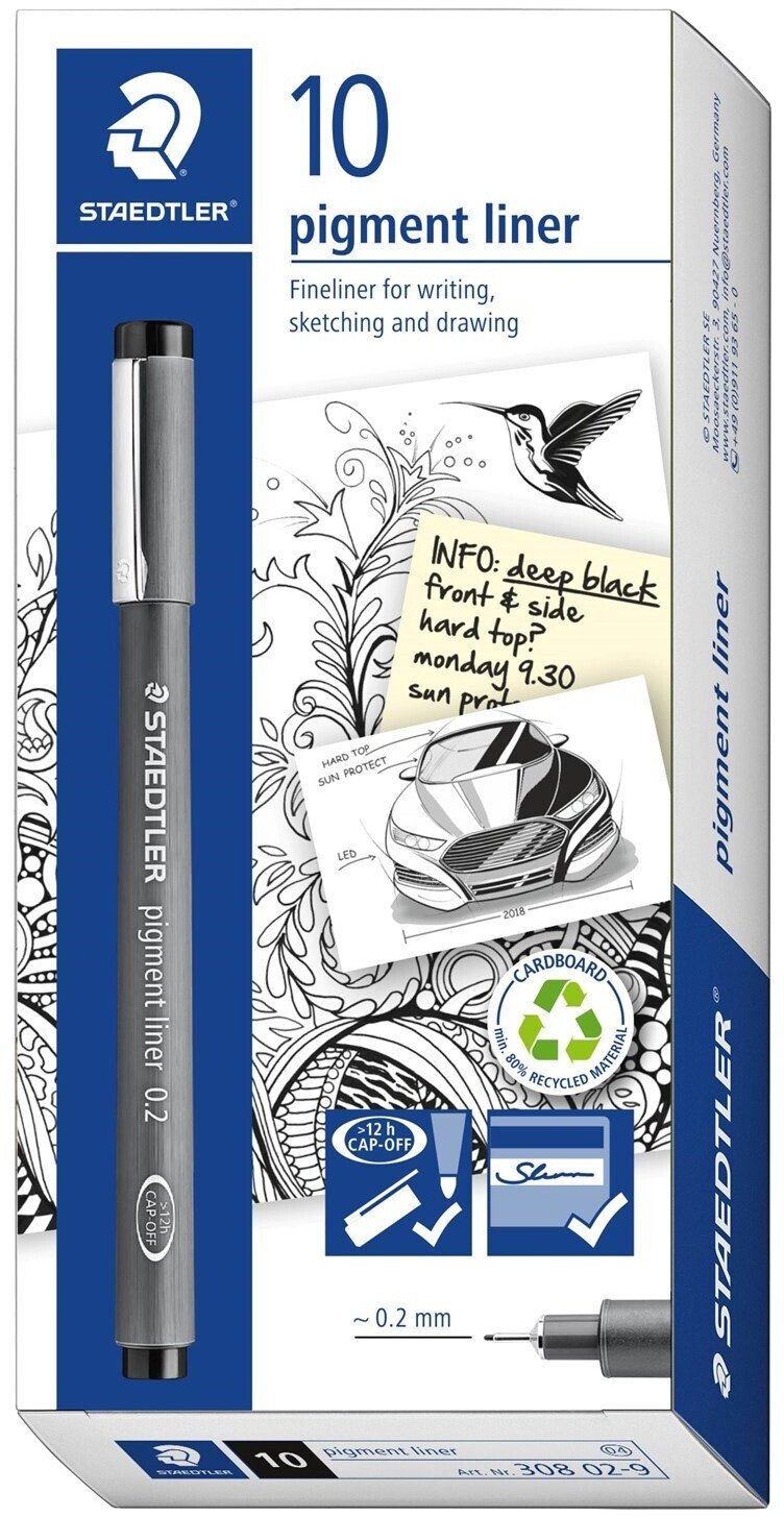 Experience the perfect blend of clarity and detail with the Staedtler Pigment Liner 0.2mm. This 10-pack of black fineliners is a favorite among professionals and hobbyists, offering a slightly bolder line that is ideal for sketching, writing, and technical drafting.