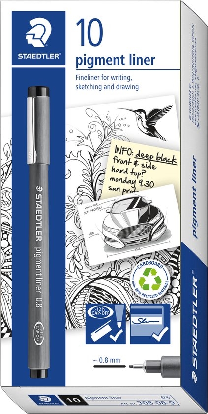 Make a bold impression with the Staedtler Pigment Liner 0.8mm. This 10-pack of black fineliners is designed for high-contrast work, offering a thick, saturated line that bridges the gap between a precision technical pen and a professional graphic marker.