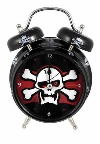 Stamped skull & crossbones on black clock frame. This pirate themed alarm clock lets out a bone chilling scream followed by an evil pirate laugh. It's sure to wake your kids & the dead too!