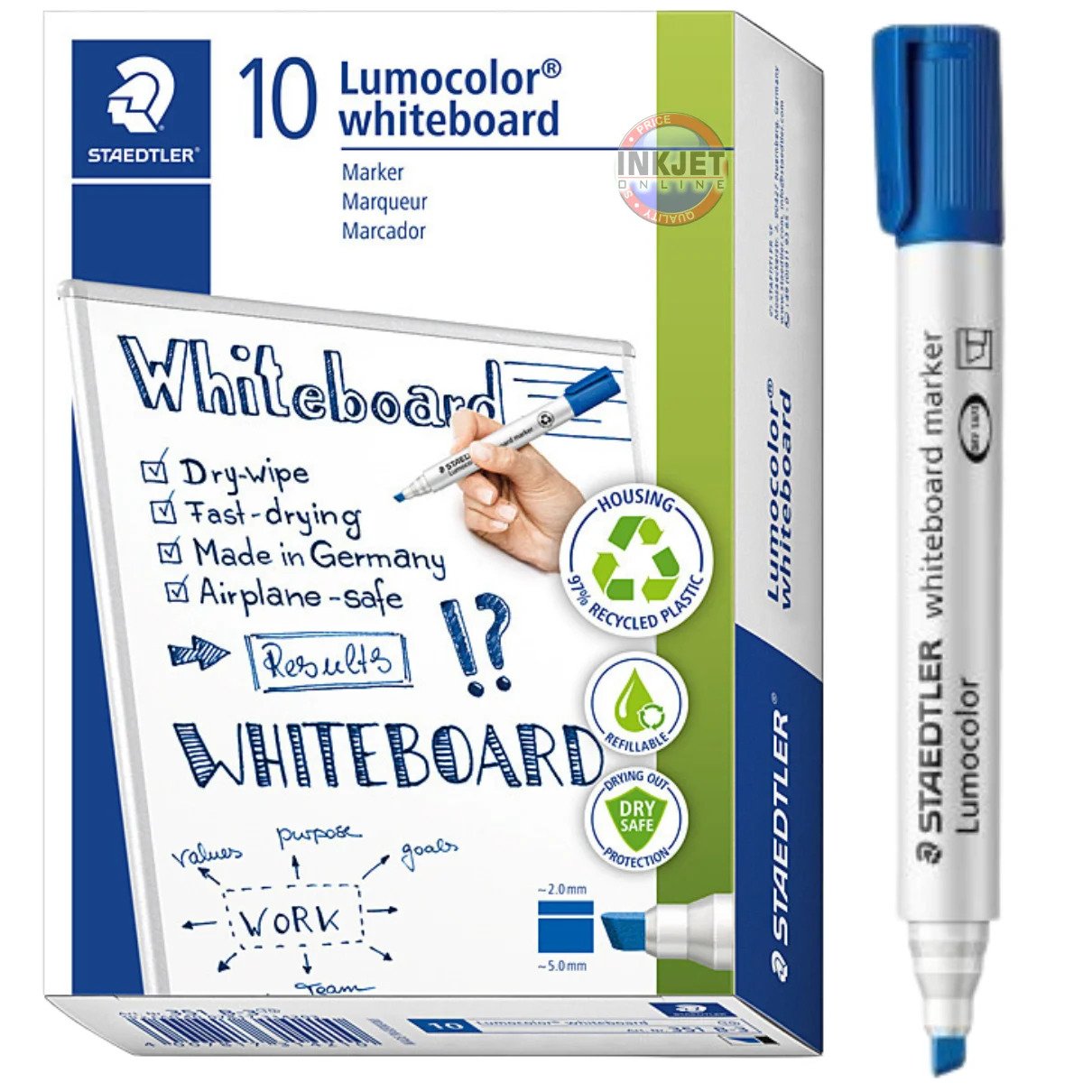 Streamline your presentations with the Staedtler Lumocolor Chisel Tip Whiteboard Markers. This box of 10 professional blue markers is the ideal choice for those who need a balance of authority and readability, providing a distinct color that stands out perfectly against white surfaces without the harshness of black.
